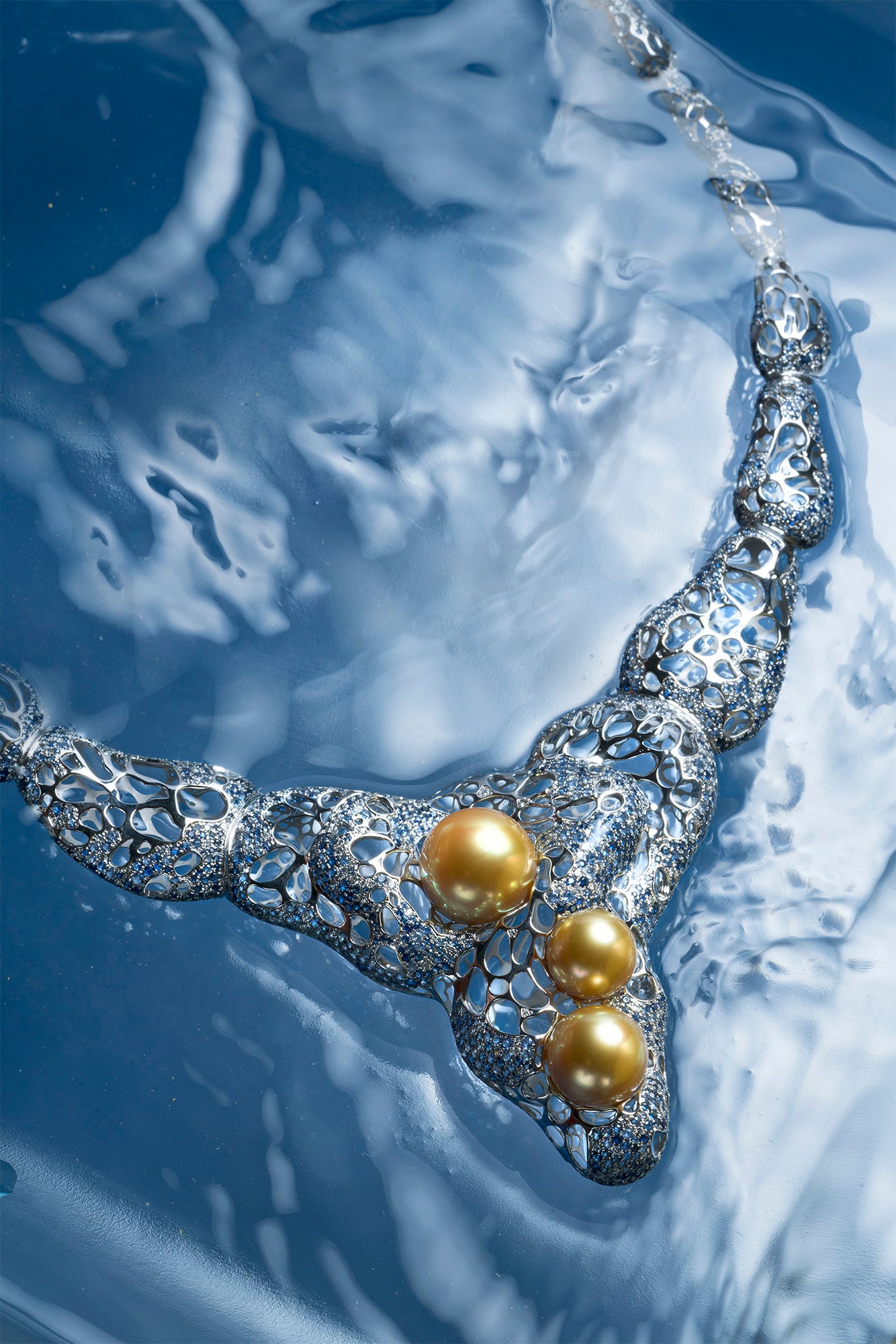 A necklace is conjured from the dance of the currents. Its gentle curve mimics the wave’s flow and movement, while the blue and gold of the ocean reflects the color of triumphant skies.