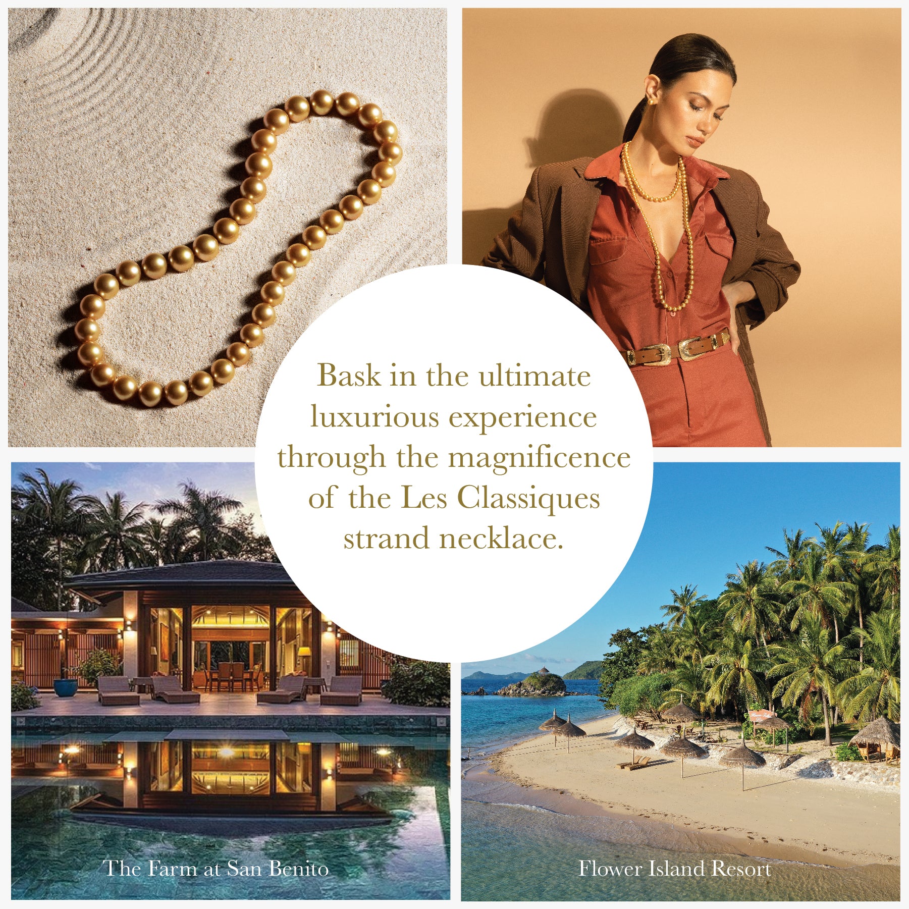 Experience the elegance of the Les Classiques strand necklace and have a blissful overnight stay for two at The Farm at San Benito Pool Villa or enjoy a grand two-night private getaway for two at the Flower Island Resort in Palawan.