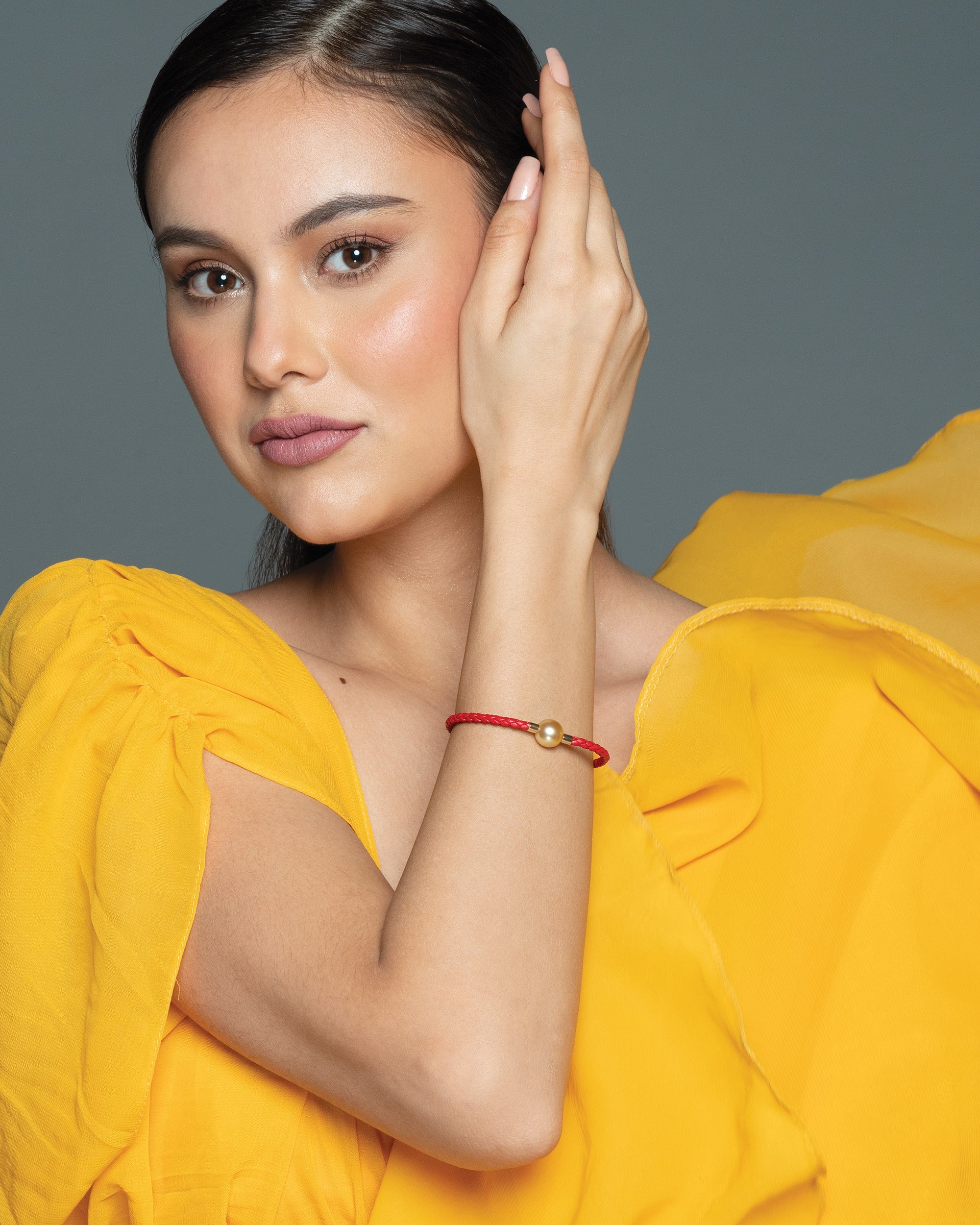 The bracelet features a lustrous golden South Sea pearl gracefully kept afloat by a cord of vibrant red leather. As a living gem, the pearl radiates energy that flows along the bracelet’s strands, honoring life’s passions and possibilities in elegant harmony.