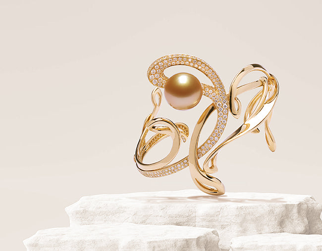 Rich gold is molded into sensual curves to boast glittering diamonds amongst florid tendrils that cradle South Sea pearls in this artfully feminine collection.