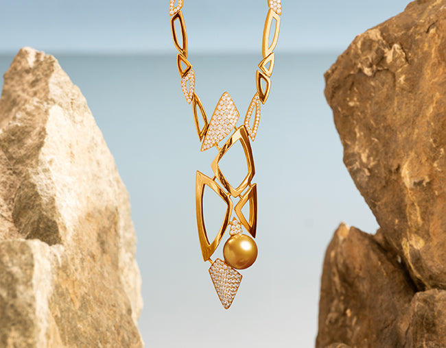 In the elegant assembly of pearls resting on a backdrop of diamonds and gold, each piece portrays a Zen garden, where pebbles, light, and water conjure serenity and mystique.